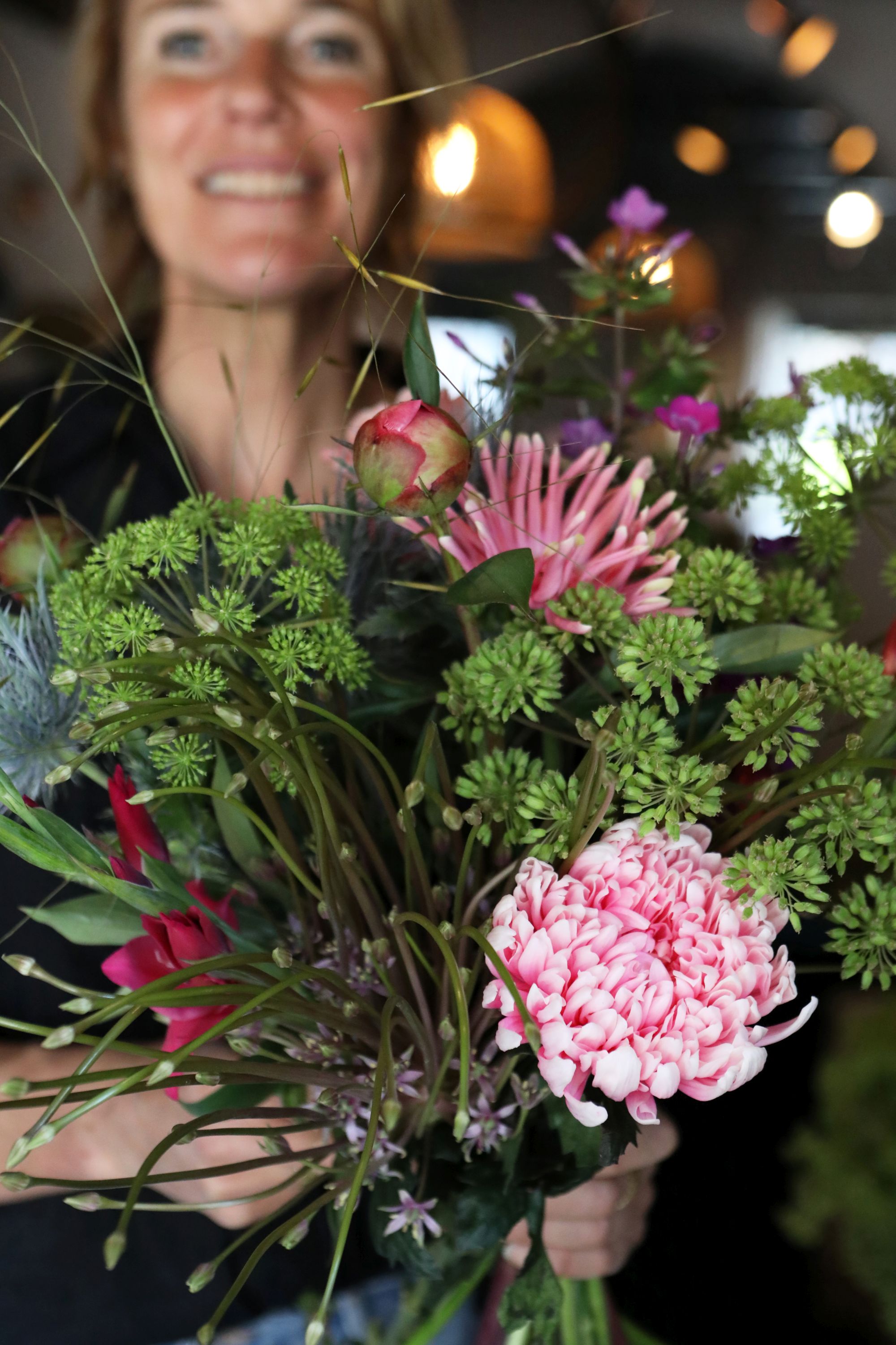 “Ik ben niet aangesloten bij een leveranciersnetwerk zoals Topbloemen. Ik regel mijn eigen inkoop en bepaal dus zelf mijn collectie bloemen. Ik koop wat ik mooi vind en blijkbaar vinden mijn klanten dit ook mooi. Een geheel eigen stijl, maar altijd zo passend bij jou. Een stijl die blijkbaar al tien jaar werkt. Ik maak de boeketten ter plekke. Dat persoonlijke bevalt me heel goed. Bloemen vertellen een verhaal.”