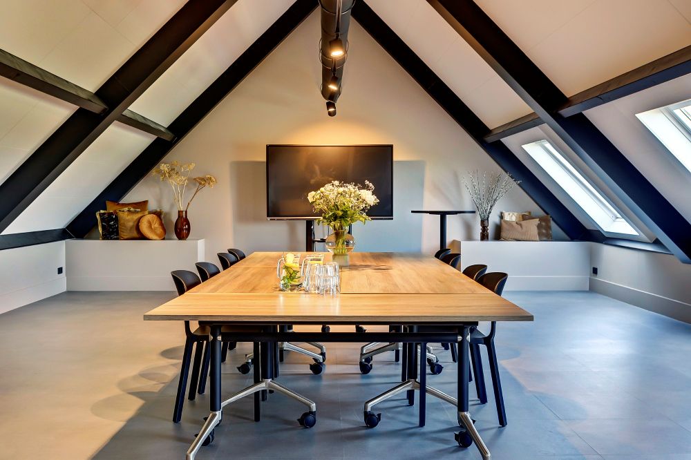 Als we de trap op lopen vinden we de aangename zolder, een ruimte die geschikt is tot 20 personen. Met eigen pantry en koelkast is het ook hier prima bijeenkomen. “Uiteraard staat onze gasten overal moderne apparatuur ter beschikking en heeft het hele gebouw verkoelende airco voor de warme dagen.”